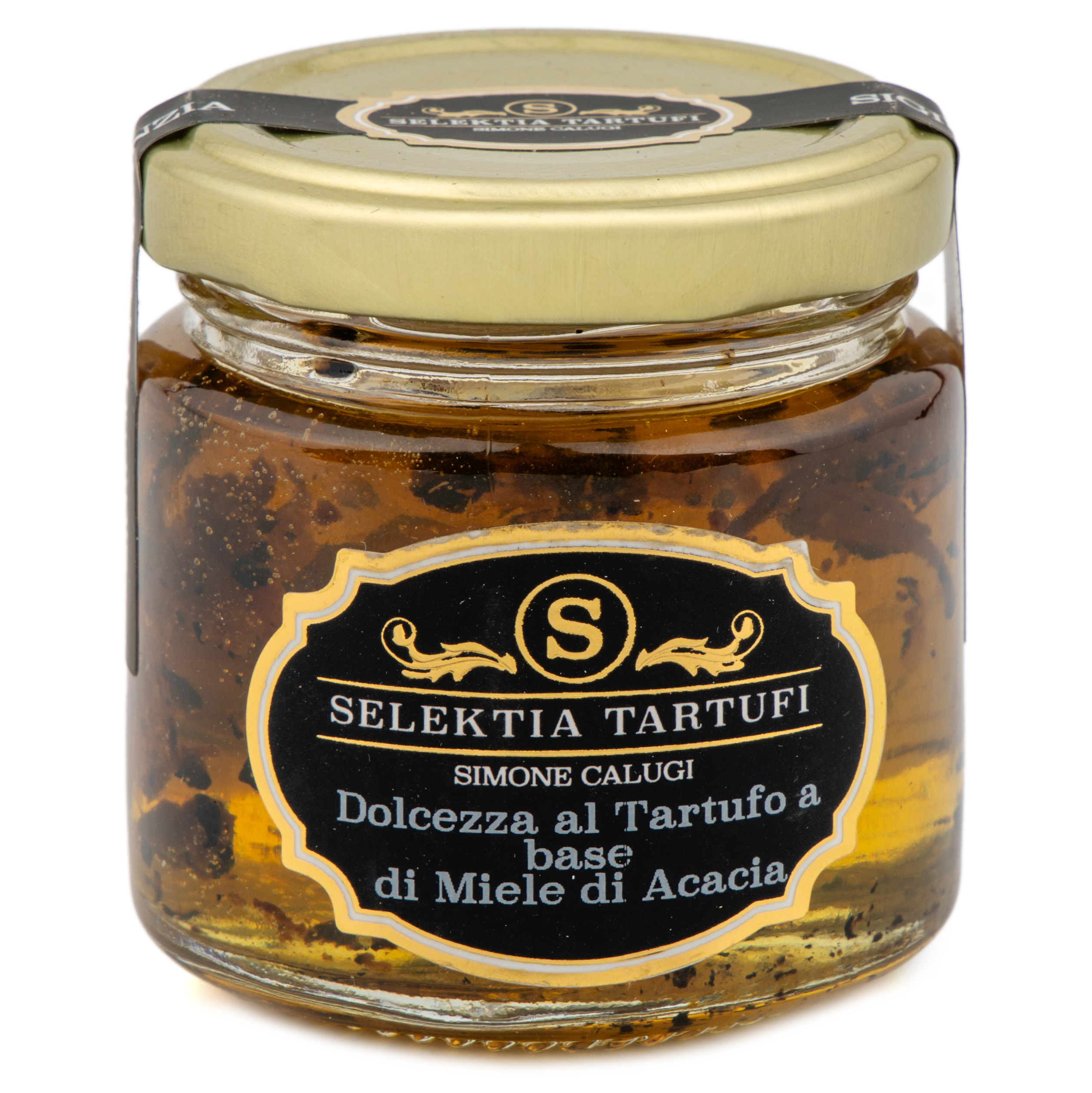 Exquisite acacia honey and black truffle. A delightful sweetness characterized by a beautiful transparent yellow color with truffle petals, a perfect balance between the sweet taste of honey and the aroma of truffle.